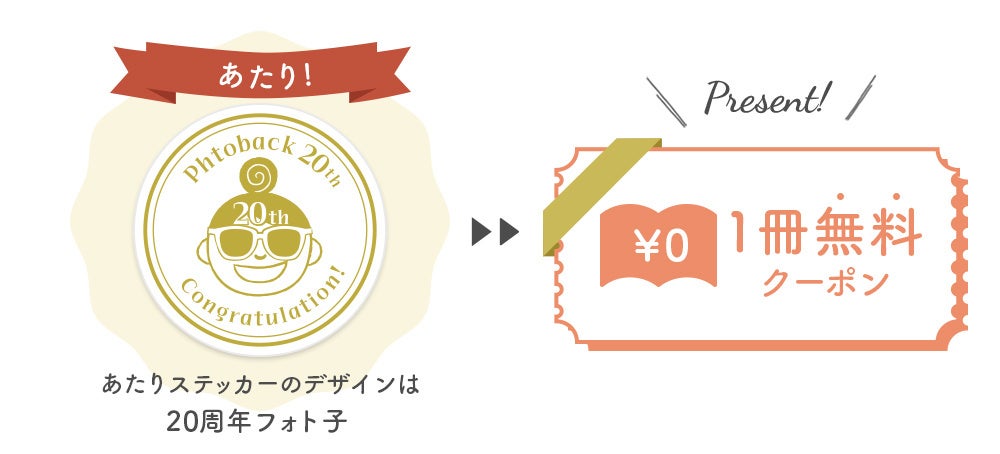 20周年フォト子ステッカーが入っていた方はあたり!応募者全員にお好きなPhotobackアイテムが1冊無料でつくれる1冊無料クーポンをお送りします。応募方法は特設サイトよりご確認ください。