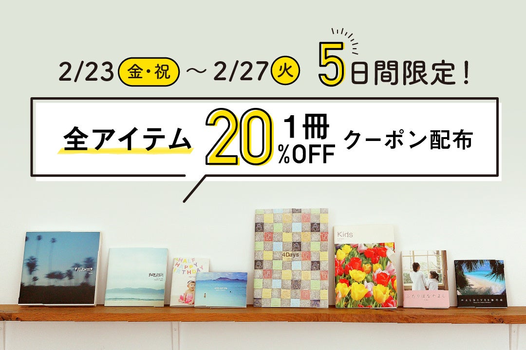 日頃ご愛顧いただいている皆様に感謝の気持ちを込めて、「Photoback全アイテム」が1冊20%OFFになるキャンペーンを実施します。クーポン配布は、2月23日(金・祝)~2月27日(火) 5日間限定!すぐつかえる20%OFFクーポン(1冊)を5日間限定でプレゼントいたします。クーポンの取得方法は特設サイトよりご確認ください。