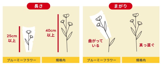 花には、茎の長さや花一輪の大きさ、色等、様々な項目で「規格」が存在し、品目や地域ごとに基準が定められています。「ブルーミーフラワー」とは、品質や見た目が良好でも規格外と判断されてしまい、価値がつきにくくなったものをブルーミーが独自に買い付けしているお花です。
