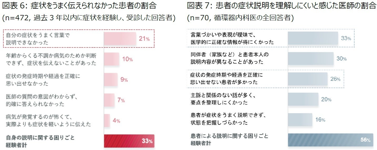 調査では診察場面におけるコミュニケーションの課題も明らかになりました。「症状を伝えることに困難を感じたことがある」と回答した割合は、患者では33%、循環器内科医では56%でした(図表6、7)。患者側では、「症状をうまく言葉で説明できなかった」(21%)が最も多く、医師側では「(患者の)言葉づかいや表現が曖昧で、医学的に正確な情報が得にくかった」(33%)が多く挙げられました。