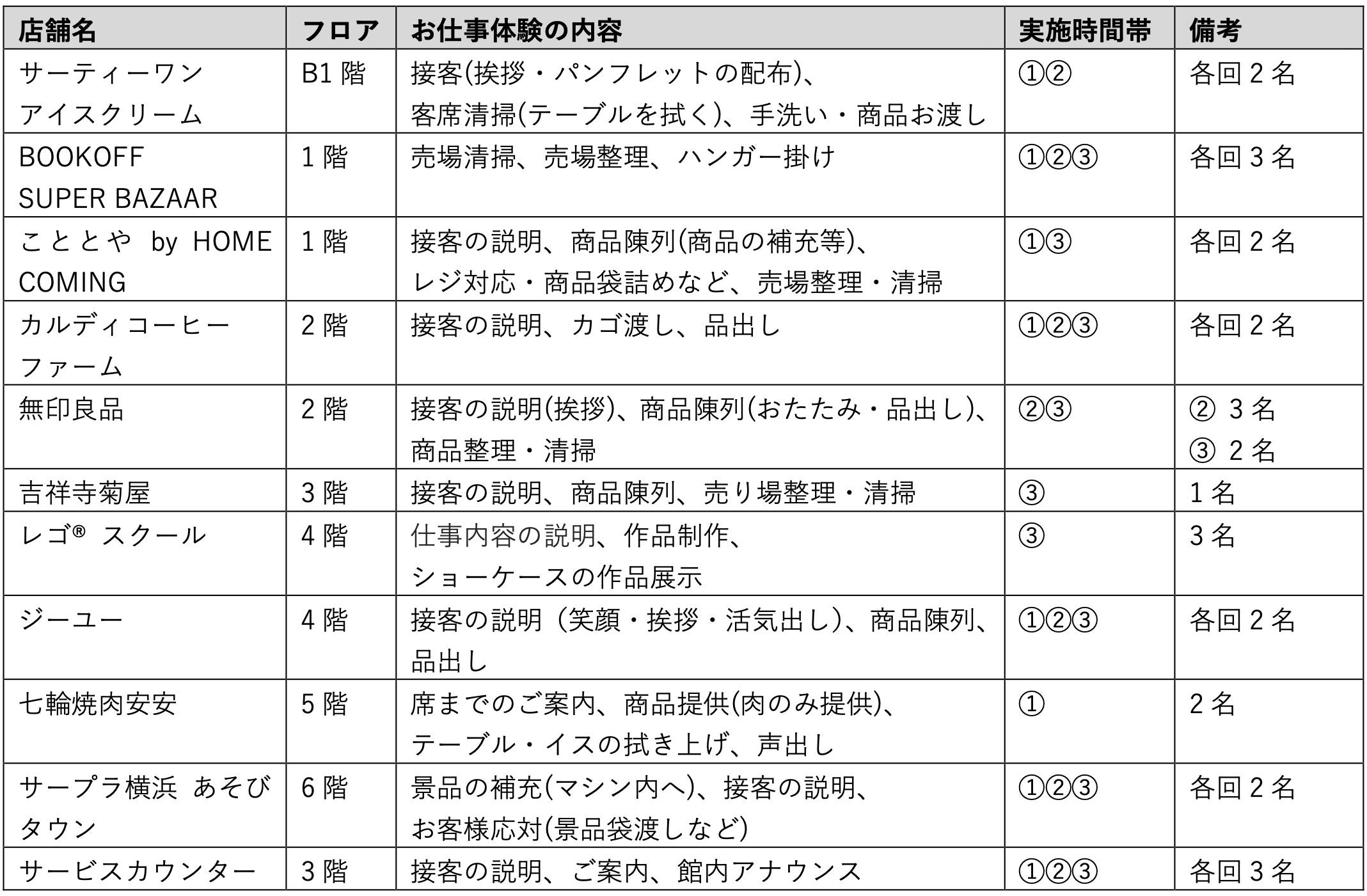 内容 : ・各店舗でのお仕事体験