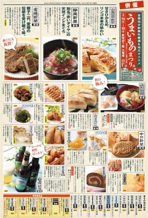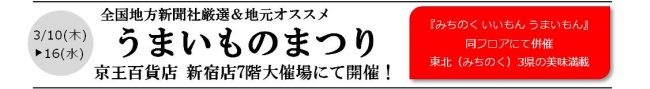 <催事概要> 【事業名称】: 全国地方新聞社厳選&地元オススメ うまいものまつり ※みちのく いいもん うまいもん 併催 【主 催】:株式会社47CLUB 【協 力】:東京新聞 【開催日時】:平成28年3月10日(木)~16日(水)の7日間 10時~20時 ※最終日は16時閉場 【会 場】:京王百貨店新宿店 7階 大催場 |