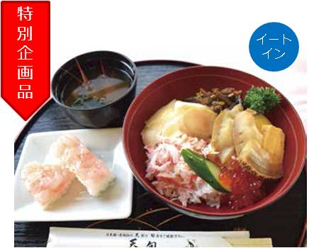 肉厚で柔らかい山形県庄内浜産の天然黒あわびのふくめ煮、かに、いくらを贅沢に載せた豪華丼。さらに、日戻り漁船で獲れた、鮮度が高く旨みのある“とろ甘海老”の押し寿司をつけた限定セットです。贅の極み、真心のこもったお膳に舌鼓!
