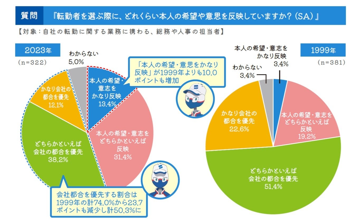 転勤に対する現在の企業の取り組みや制度の実態をはじめ、1999年に発表した同調査との傾向の違いや、転勤に関する今後の意向についても明らかになりました。