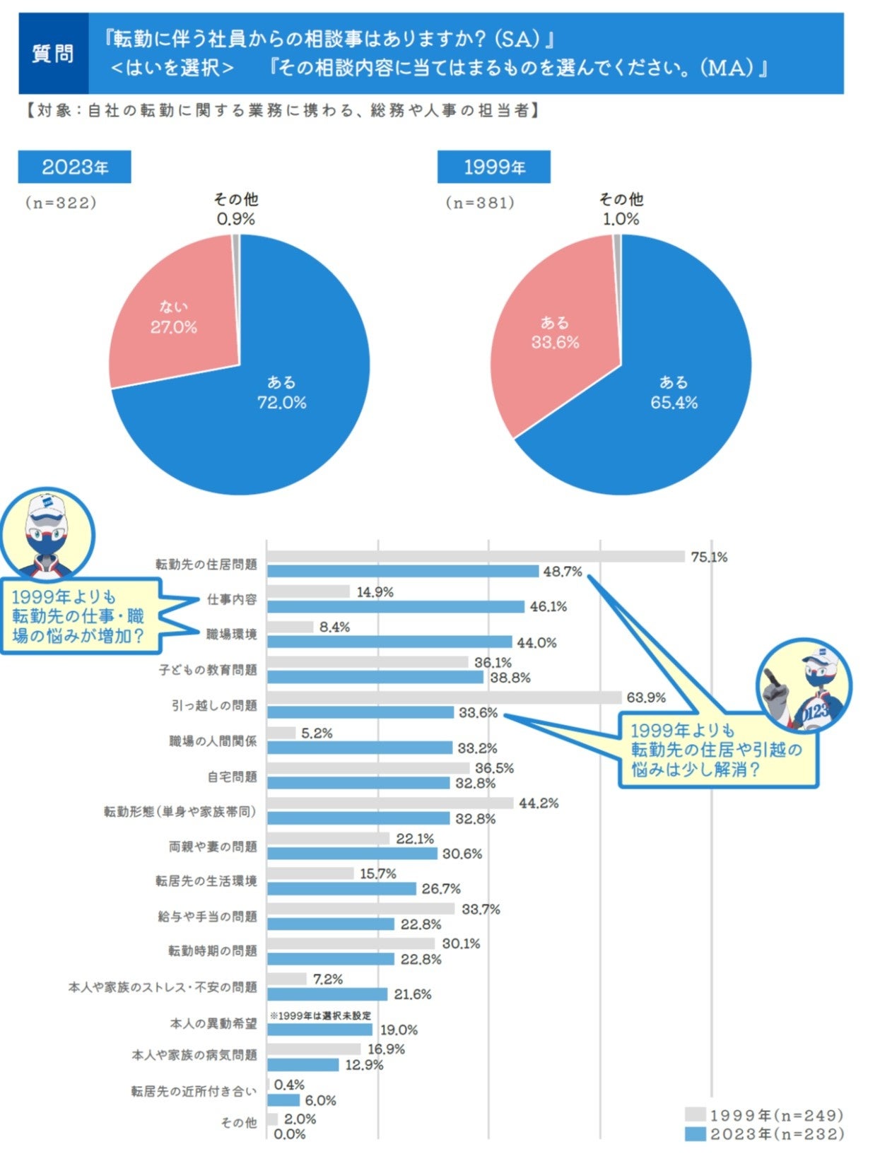 なお1999年に発表した同調査では「転勤先の住居問題」(75.1%)、「引っ越しの問題」(63.9%)、「転勤形態」(44.2%)となり、また全体的にも相談内容の傾向が変化していることが伺えます。