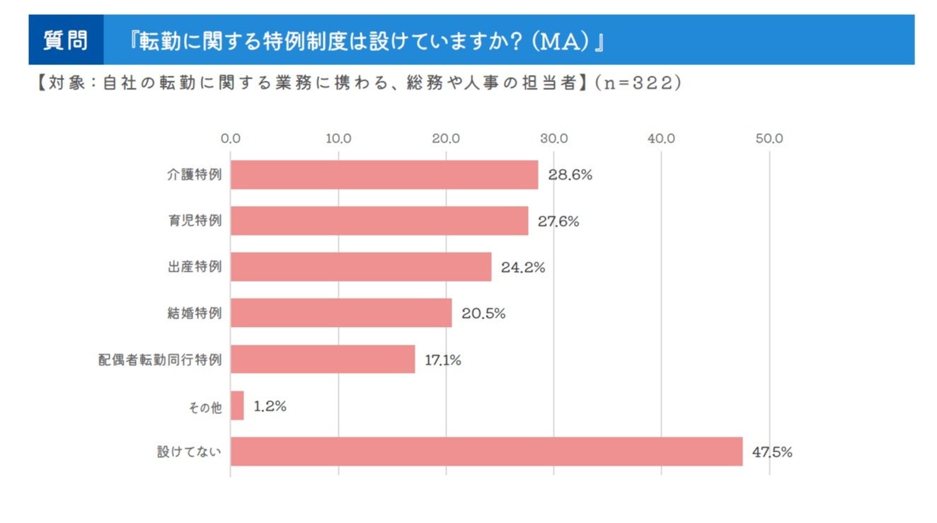 転勤に関する特例制度については52.5%の担当者が転勤に関する特例制度を設置していると回答。