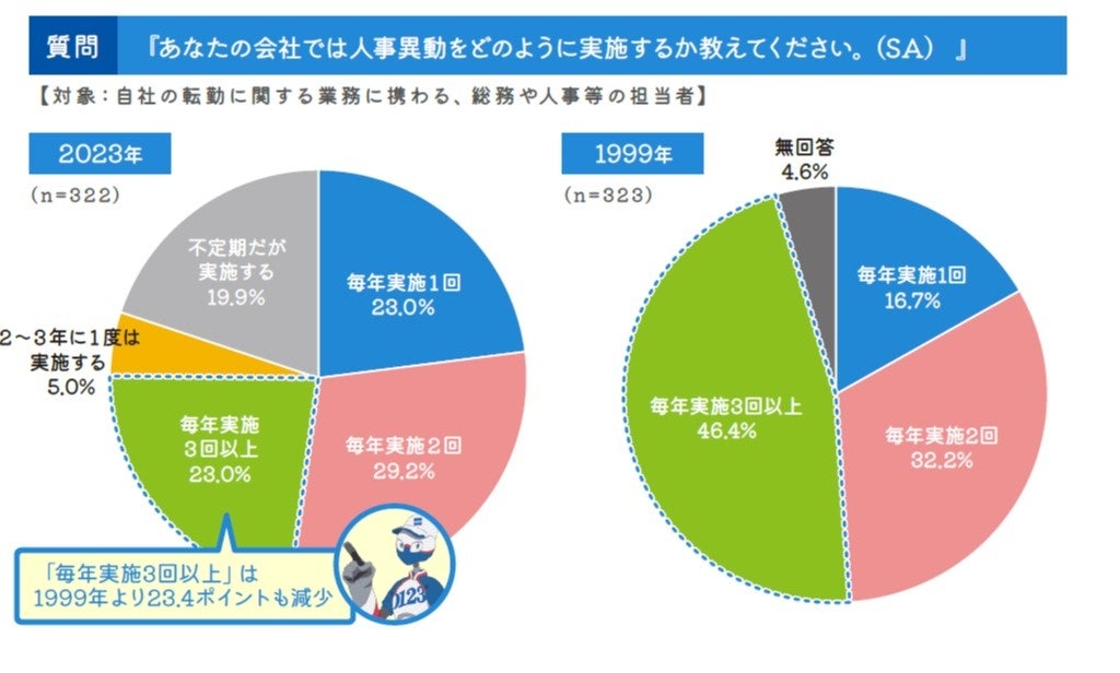 「毎年3回以上実施」が23.4ポイントも減少しており、年間の人事異動の頻度は減少傾向であること