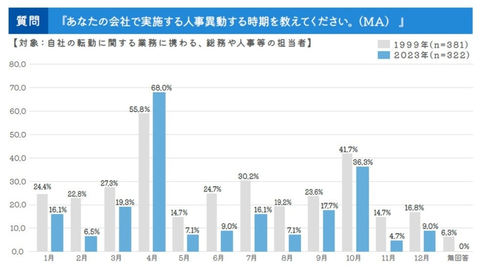 人事異動の最も多い月は4月(68.0%)で、次いで10月(36.3%)、3 月(19.3%)、9 月(17.7%)の順となりました。1999年に発表した調査と比較しても、4月と10月の人事異動が突出して多い傾向に大きな変化はありませんが、他の月は減少していることが読み取れます。