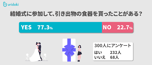 そこで、C2Bの買取プラットフォーム「ウリドキ」(https://uridoki.net/ )を運営するウリドキ株式会社(所在地:東京都千代田区、代表取締役:木暮 康雄)は、結婚式の引き出物についてアンケートを実施しました。