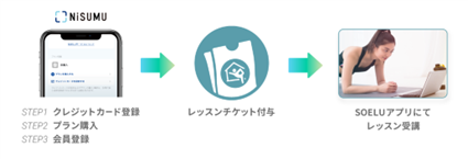 NiSUMUおよび「お家でフィットネス」導入タウンの住民は、NiSUMUアカウントからSOELUアプリの利用が可能となり、特別価格でオンラインレッスンを受講することができます。