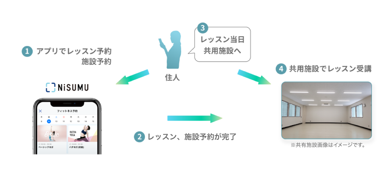 NiSUMUおよび「フィットネス予約」導入タウンの住民は、NiSUMUアプリからレッスンおよび施設予約することで、共用施設内でオンラインレッスンを受講することができます。