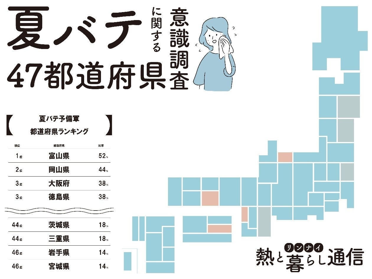 「夏バテ予備軍」が多い地域は、富山(52%)、岡山(44%)、大阪・徳島(38%)でした。反対に少ない地域は、岩手・宮城(14%)、茨城・三重(18%)でした。