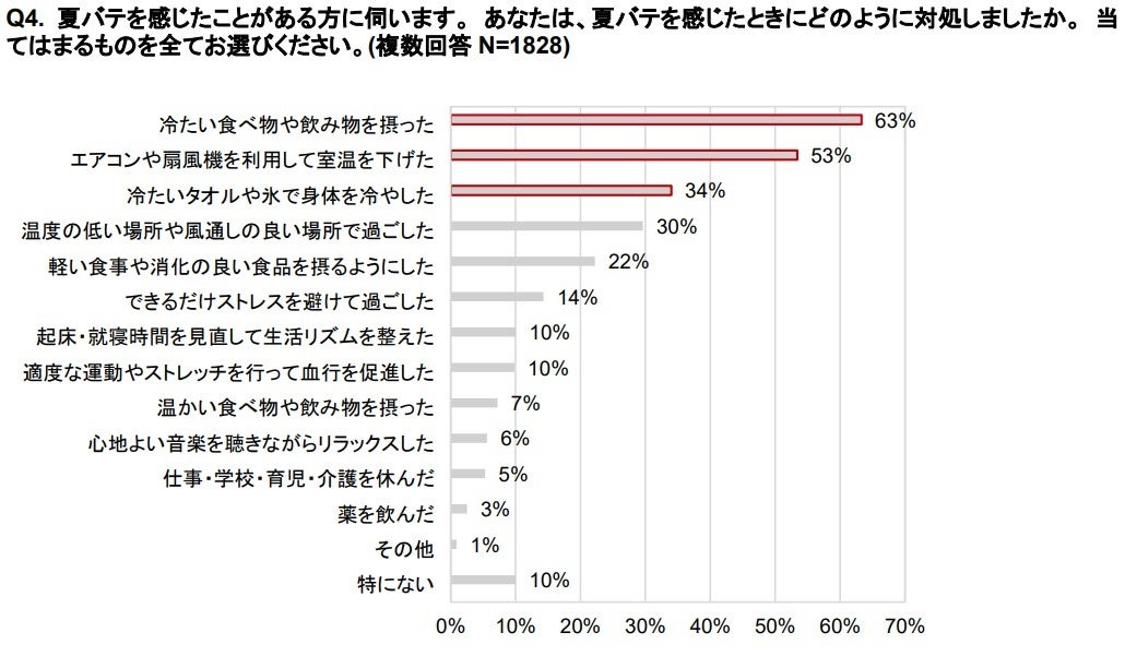 夏バテの経験者に、その対処法を聞きました。最も多い回答は「冷たい食べ物や飲み物を摂った(63%)」、続いて「エアコンや扇風機を利用して室温を下げた(53%)」、「冷たいタオルや氷で身体を冷やした(34%)」など、いずれも身体を冷やす方法が多く挙がりました。