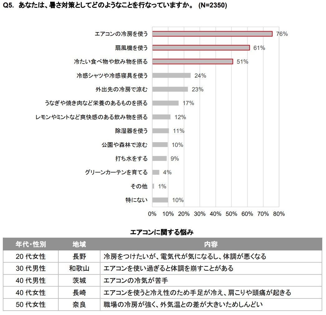 普段の暑さ対策に関して聞きました。最も多い方法は「エアコンの冷房を使う(76%)」でした。エアコンに続く対策は「扇風機を使う(61%)」、「冷たい食べ物や飲み物を摂る(51%)」でした。