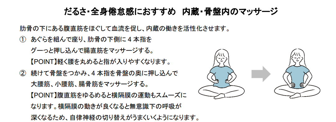 夏バテの対処法として挙がった回答には、身体を冷やす行為が目立ちました。私たちは空調の効いた屋内と外の温度差によって、寒暖差疲労を起こしやすくなっています。現代の夏バテの症状を改善するには、急激な体温調整によって負荷のかかった自律神経の乱れを整えることが肝心です。温かい食べ物や入浴で身体を温め、冷たい飲み物や食べ物、カフェインやアルコールは摂り過ぎないようにしましょう。食欲の低下、胃痛、吐き気、腹部膨満感、吐き気、下痢や便秘気味などがあると、胃腸の状態が安定しません。発酵食品も腸内環境を良い状態にします。ヨーグルトやみそなどの発酵食品を、生活中で取り入れましょう。夏バテの症状で多い、だるさ・全身倦怠感には、内蔵・骨盤内のマッサージをおすすめします。また起床時は、体が脱水傾向にあるので、コップ1杯の水か白湯を飲むようにしましょう。胃腸の動きも整います。