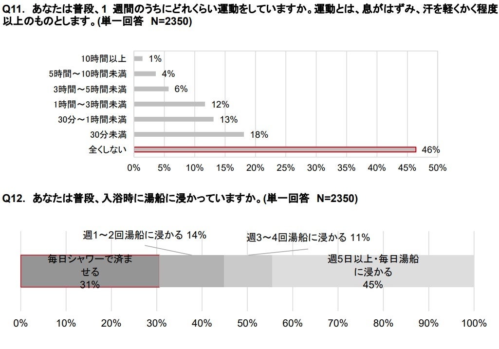 生活習慣を確認するため、運動と入浴習慣を聞きました。その結果、運動については5割が「全くしない」、入浴は3割が「シャワーで済ませる」ことが分かりました。