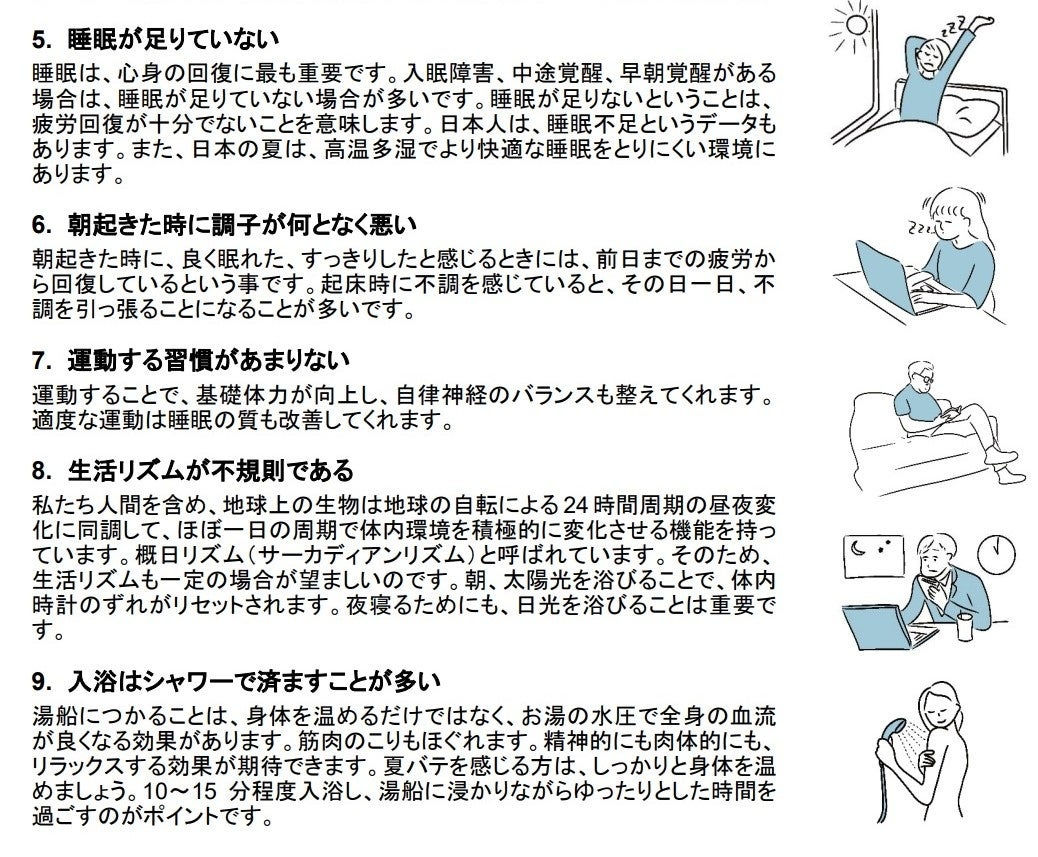 心身の回復に休息は不可欠ですが、日本人は休み下手です。今回の調査でも、夏バテのために、ストレス回避やリラックス、仕事などを休むという回答は限られていました。夏の暑さだけに着目してしまいがちですが、自律神経の乱れが夏バテの症状を悪化させています。睡眠不足や、スマホ・PC使用時間の増加、精神的なストレスなど、自律神経を乱す要因は様々です。しっかりと休んで、これらの要因を排除しましょう。