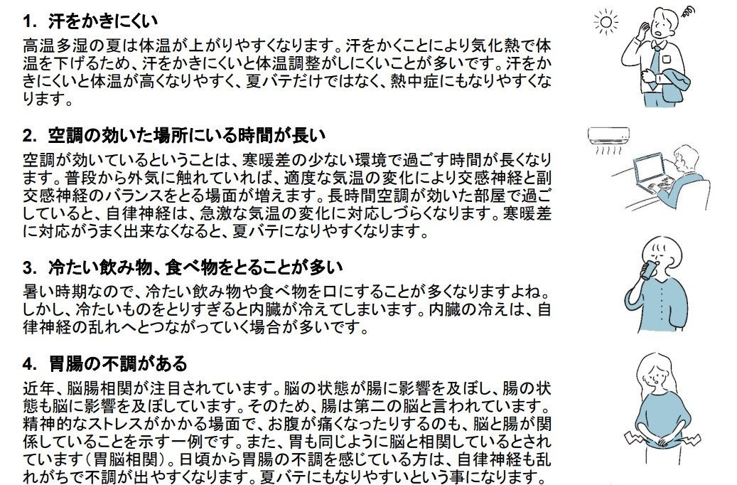 めまいや吐き気なども含め、これらの症状は自律神経の乱れが原因と考えられます。夏バテには多くの症状があり、人それぞれ異なります。単に暑いから調子が悪い、と考えるのではなく、まずは患者自身がしっかりと症状に向き合い、正しい対処法を理解しましょう。周りから理解されづらいため苦しむ患者さんもいます。周りもサポートできるような世の中にしたいですね。