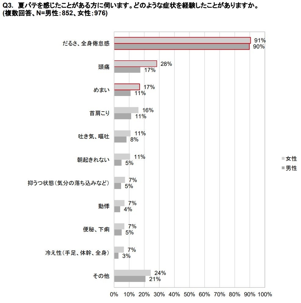 夏バテの経験者に主な症状を聞きました。その結果、最も多い回答は男女ともに「だるさ・全身倦怠感(男性:90%、女性:91%)」でした。「頭痛(女性:28%)」や「めまい(女性:17%)」など、女性は男性に比べて複数の症状に悩まされていることが分かりました。