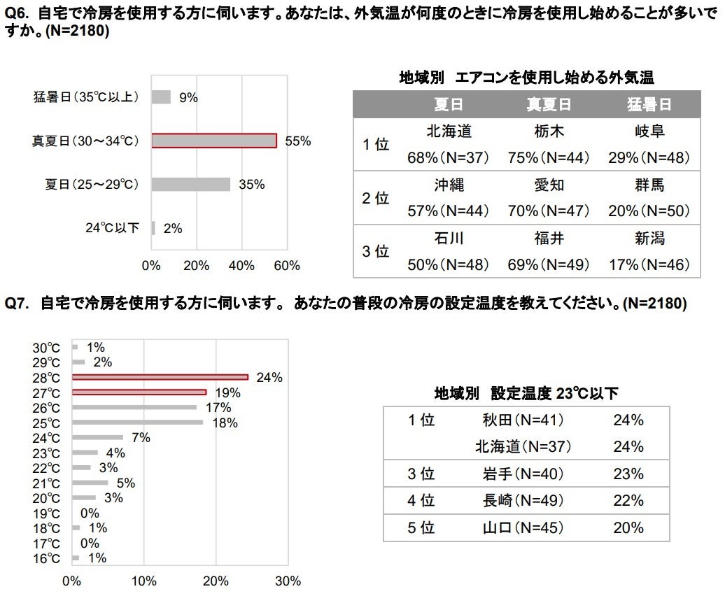 また、冷房の設定温度は、最も多い回答が28℃(24%)、続いて27℃(19%)でした。23℃以下を設定する地域に寒冷地が多いなか、長崎(22%)が上位にランクインしました。