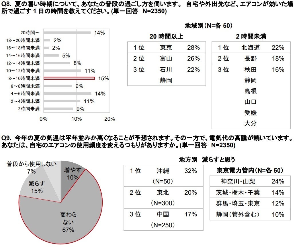 また、電気代高騰と猛暑が予想される今夏について、自宅のエアコンの使用頻度の見込みを聞きました。その結果、最も多い回答は「変わらない(67%)」でした。地方別の「減らす」の回答は沖縄(32%)、また「無理のない範囲での節電」が呼びかけられた東京エリアでは神奈川・山梨(24%)が全体より高い水準でした。