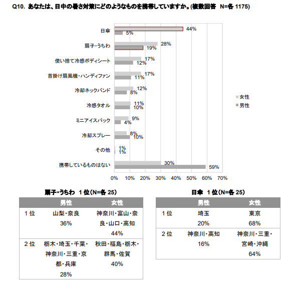 今回の調査で、エアコンに頼り切っている私たちの暮らしが明らかになりました。そこで、暑さ対策として携帯するグッズを聞きました。その結果、女性は「日傘(44%)」が最も多く、地域別では、東京(68%)、神奈川・三重・宮崎・沖縄(64%)が目立ちました。男性は「扇子・うちわ(19%)」が最も多いなか、地域別では「日傘」も埼玉(20%)、神奈川・高知(16%)で多く見られました。