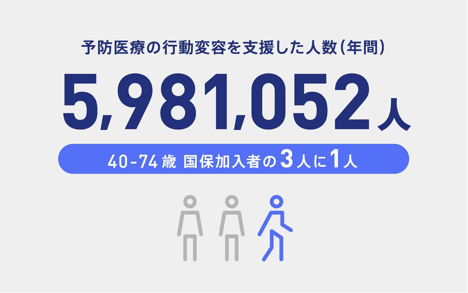 特定健康診断受診率向上事業として、全国の5,981,052人に対し、特定健康診断の受診を促すコミュニケーションを実施しました。2019年度から3年間で倍の規模に拡大しており、国保の特定健診対象者(約1,786万人)のうち、3人に1人の行動変容を支援したことになります。