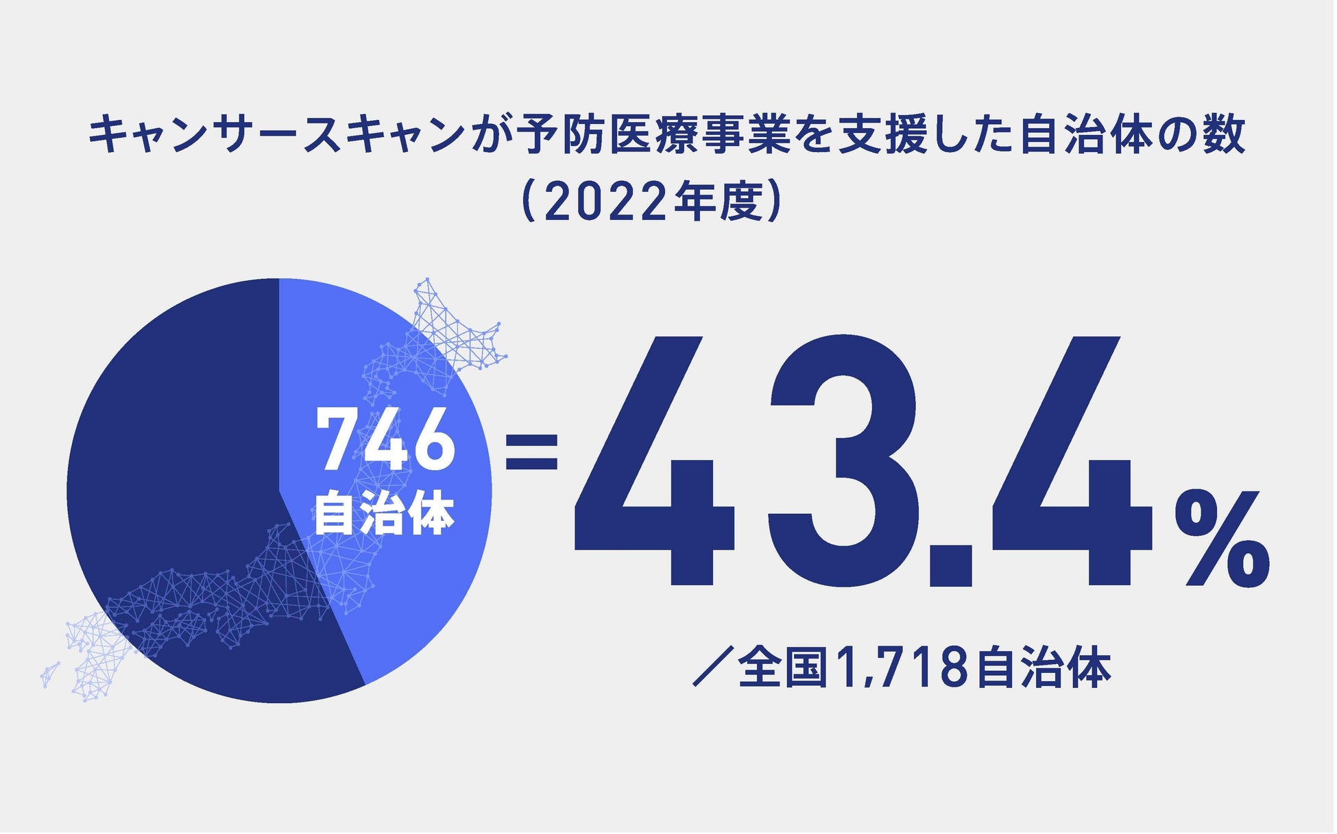 予防医療の推進を支援する株式会社キャンサースキャン(本社:東京都品川区、代表者:代表取締役社長 福吉 潤、以下「キャンサースキャン」)は、2022年度、日本の市区町村、全1,718自治体の約43.4%に当たる746の自治体様の予防医療事業を支援いたしました。