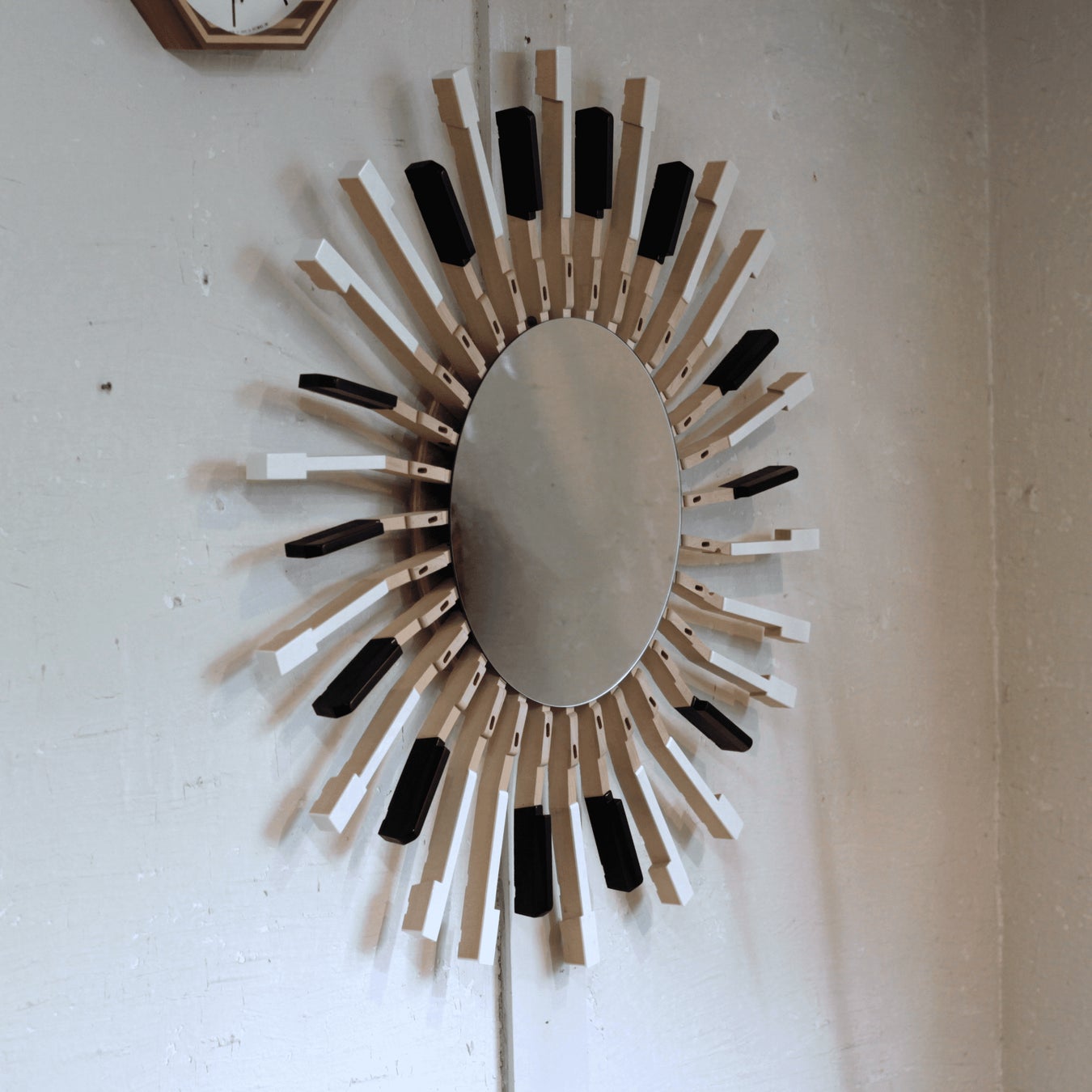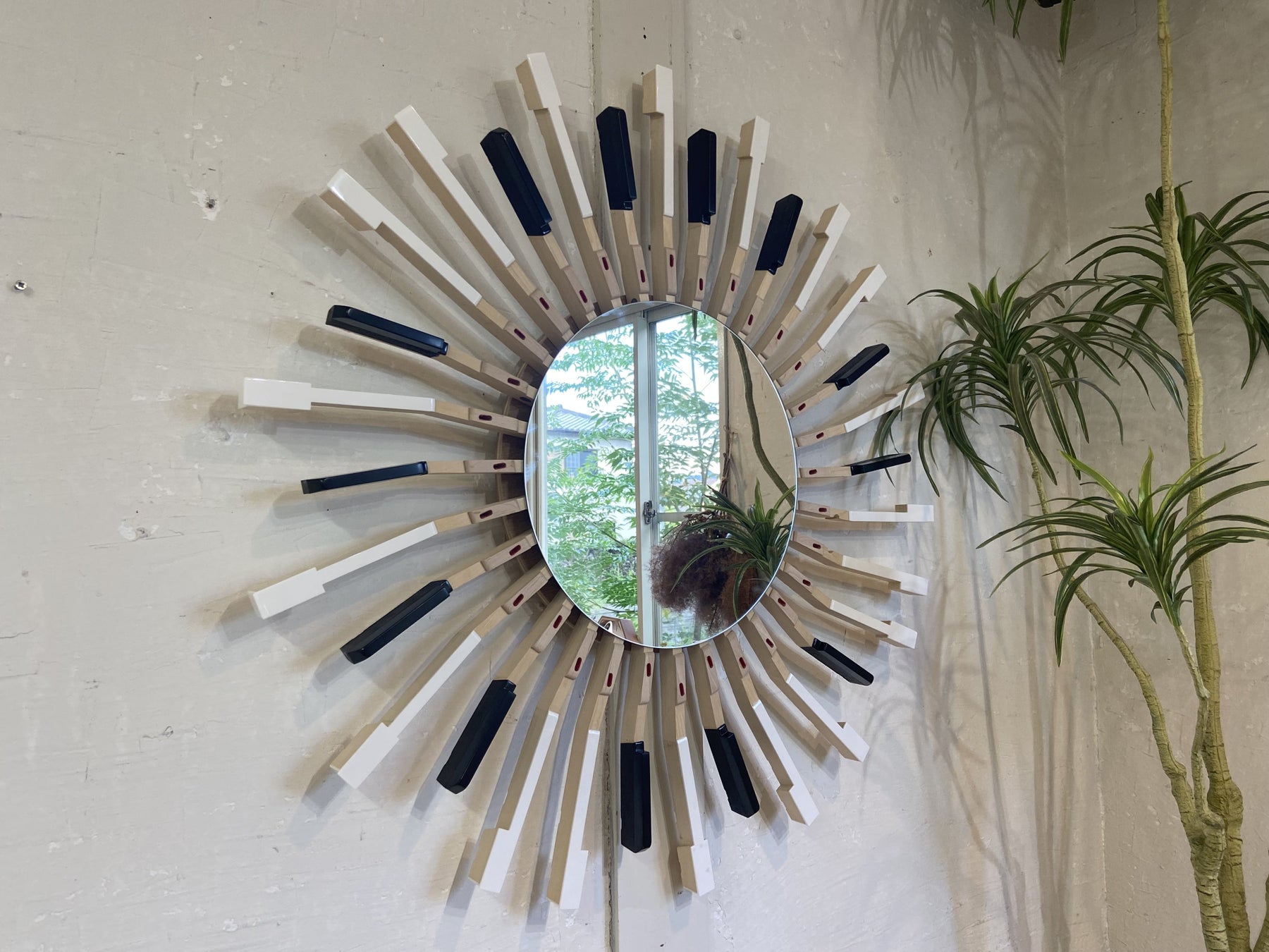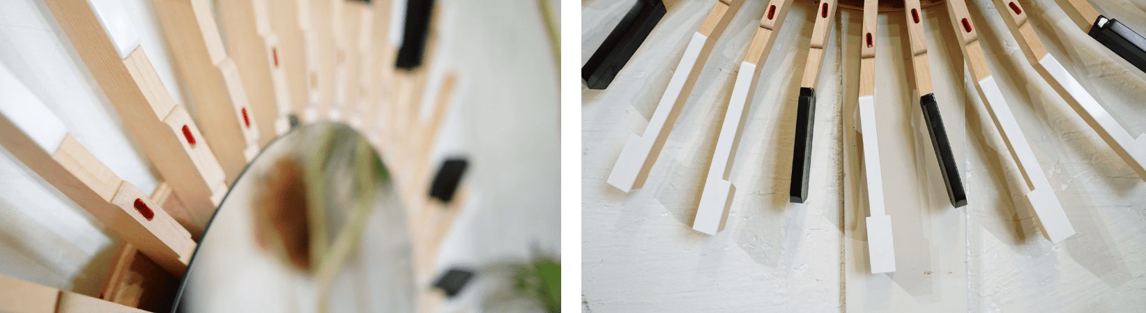 アコースティックピアノは、家庭や学校などで長年愛用されるため、定期的なメンテナンスが必要となります。その際、劣化などを理由に鍵盤を交換するという修理作業も発生いたします。ピアノ鍵盤ミラーでは、交換時に発生した『使い古しの鍵盤』を使用しています。見た目に問題のない鍵盤も数多くあり、捨てるにはもったいない。そんな想いから再びいのちを吹き込み、ミラーとして生まれ変わらせました。太陽をイメージし、円形の鏡の周囲に白鍵と黒鍵を放射状に交互に取り付けているのが特徴です。ミラーとして使用するのはもちろん、お部屋に飾るオブジェとしても存在感を発揮します。