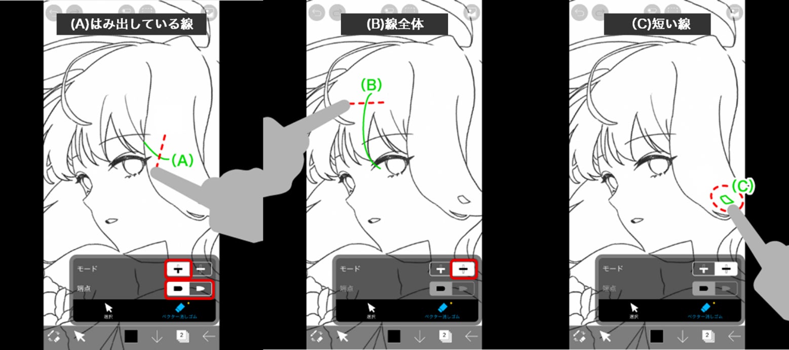 画面上をドラッグすることで、その軌跡と触れた線をカットすることができる「ベクター消しゴム」機能を追加しました。設定により「軌跡と触れた線の全体」を削除するモードと「軌跡との交点から他の線との交点までの部分」を削除するモードを選択することができます。これにより、ベクターレイヤー上の線を除去したりカットしたりする作業をより直感的に行うことができるようになりました。