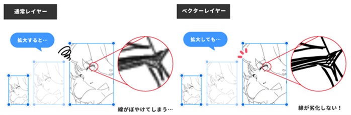 ベクターレイヤーは、拡大・縮小しても線が劣化せず、引いた線についてペンの種類・太さ・色等を再編集することができるため、イラストの線画用レイヤーとして多くのユーザーの皆さまにご好評をいただいています。