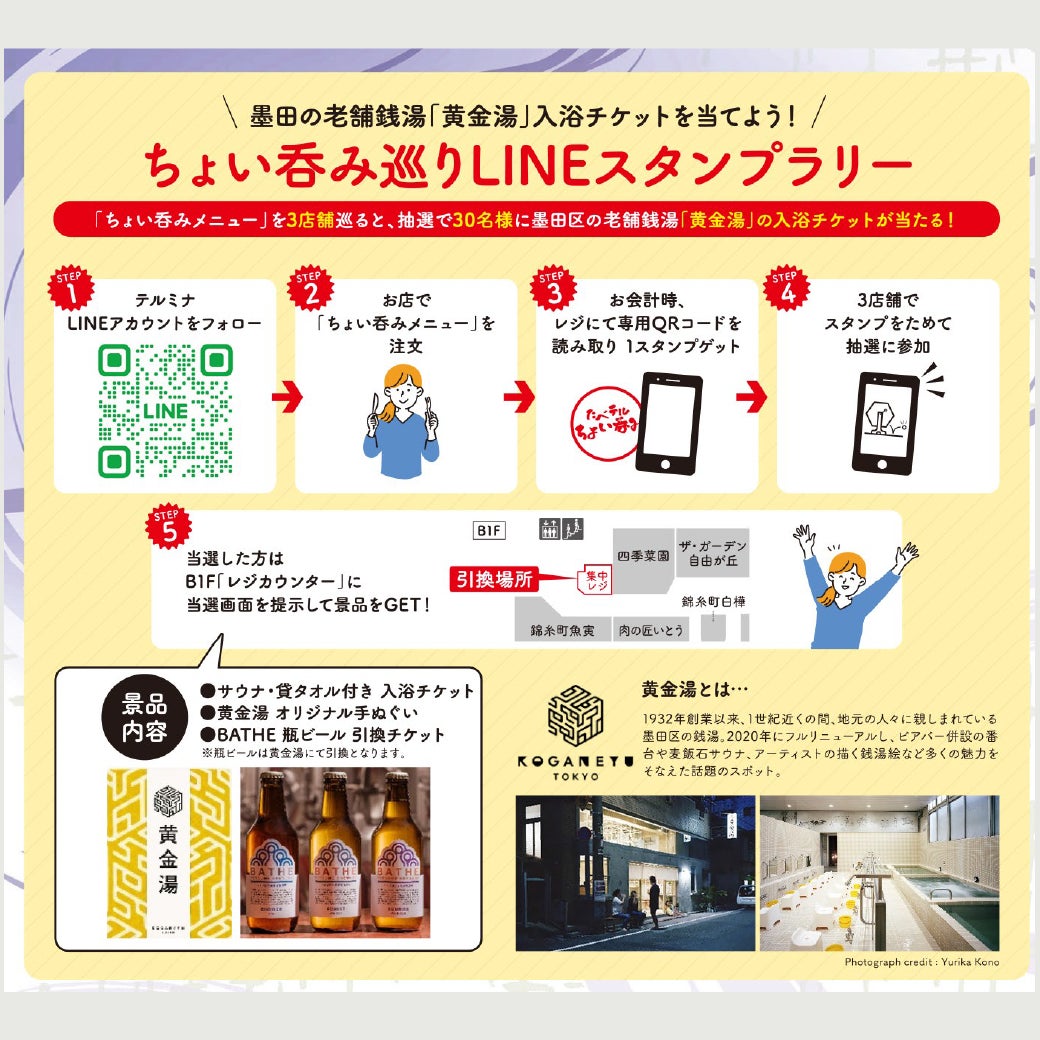 テルミナ5F飲食フロア内の11店舗※にてお仕事帰りの“サクっと飲み“、ふらっと“ひとり飲み“など気軽にお酒を楽しめる【ちょい呑みセット】を提供いたします。本キャンペーン限定の商品も多数登場し、各店こだわりの料理とともにビールや日本酒など、お酒好きにはたまらないラインアップで贅沢な時間をお過ごしいただけます。キャンペーン期間中は、テルミナ公式LINEにて地元墨田区の老舗銭湯「黄金湯(こがねゆ)」の入浴チケットが当たる「ちょい呑み巡りLINEスタンプラリーキャンペーン」も開催いたします。