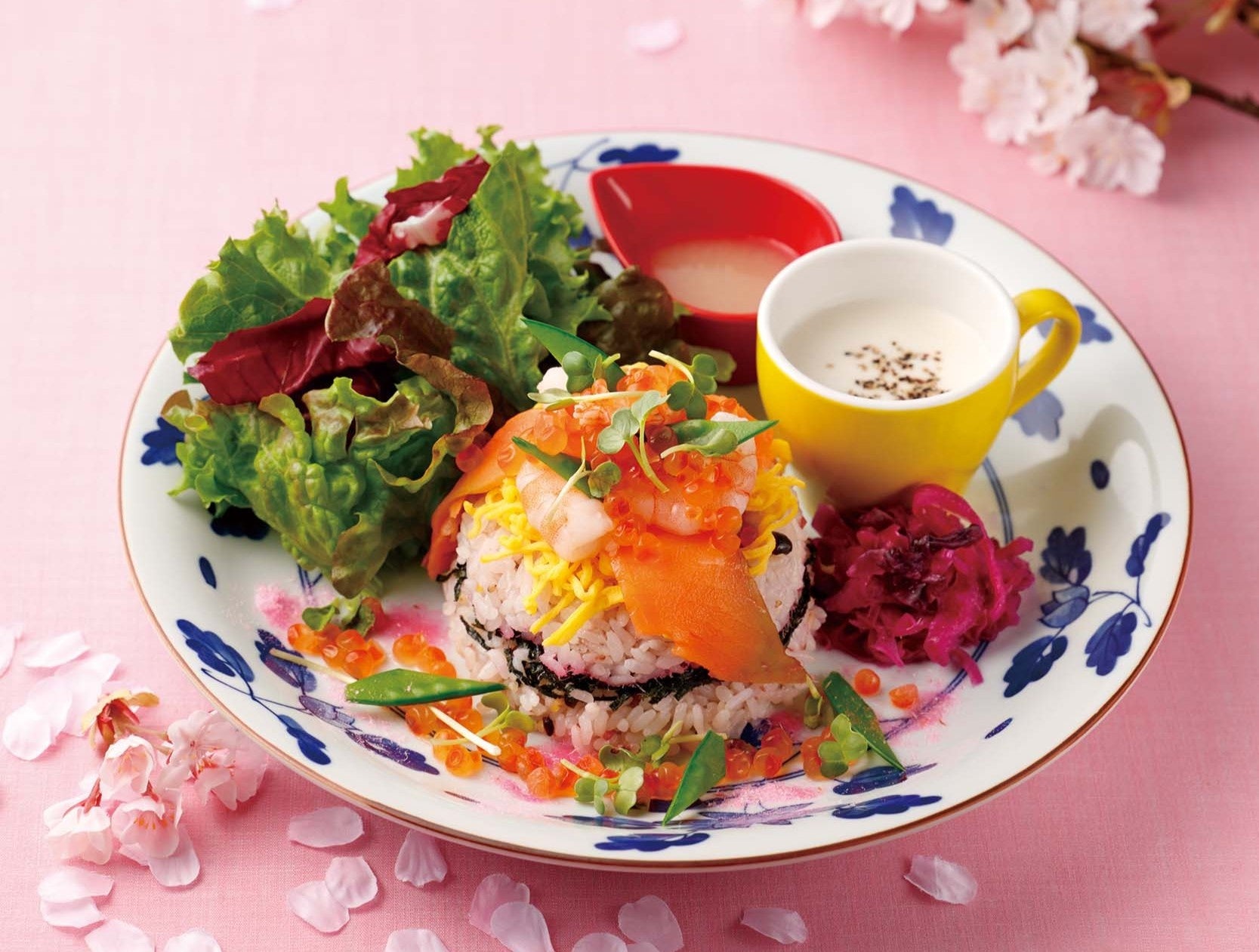 さくらの香りをまとわせた「さくら寿司」に海老、サーモン、錦糸卵、きぬさや、桜デンブ等、華やかに盛り付けた春色サラダごはん。目でも春を感じる一品です。