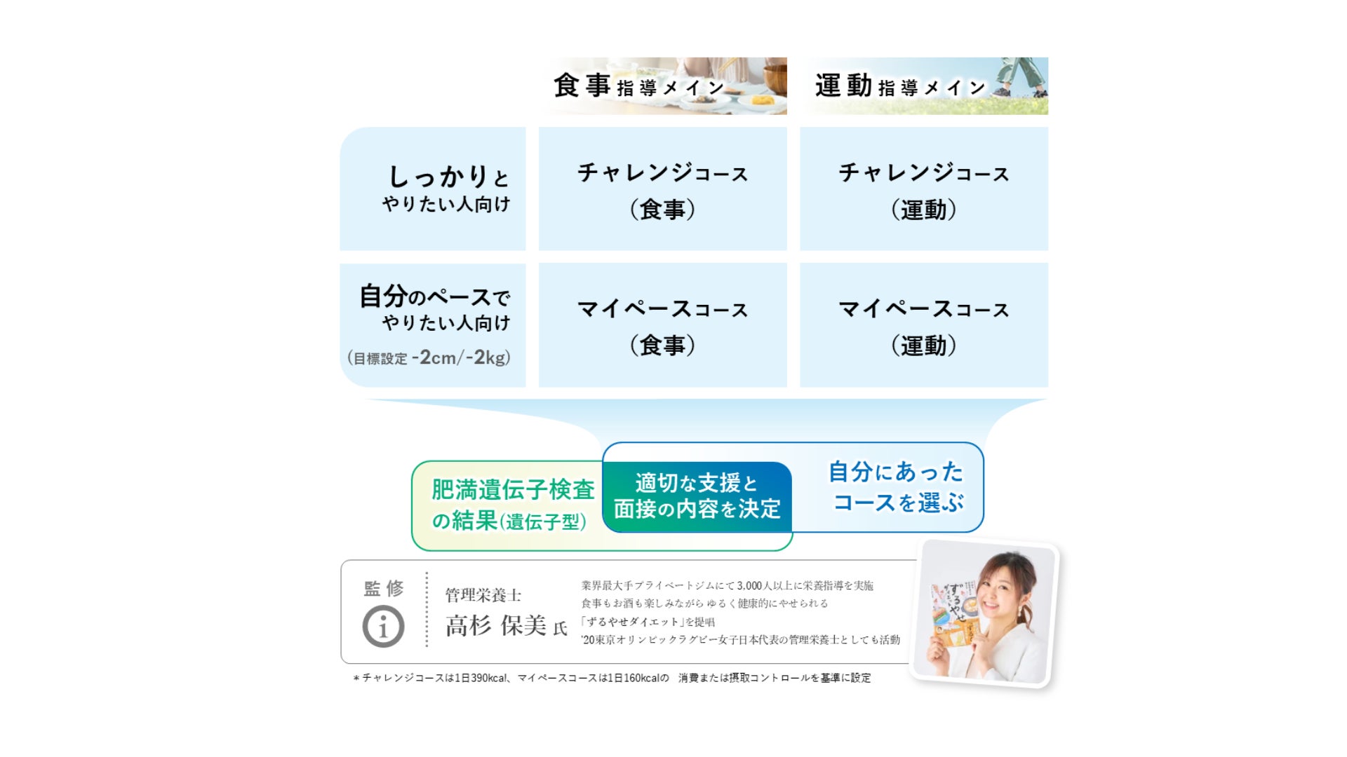 食事や運動の指導を対象者のライフスタイルに合わせて選択可能にします。肥満遺伝子検査結果と合わせた適切な支援ができるよう、面接時に具体的な目標を決定します。