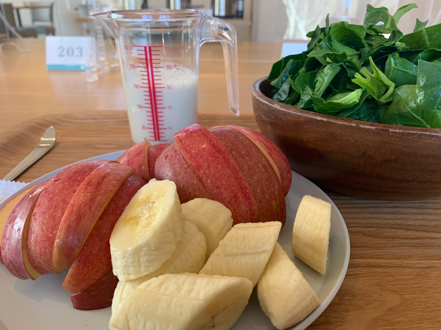 テーブルに用意された、果物と野菜を、セルフで、ミキサーにかけて、ジュースを用意する。