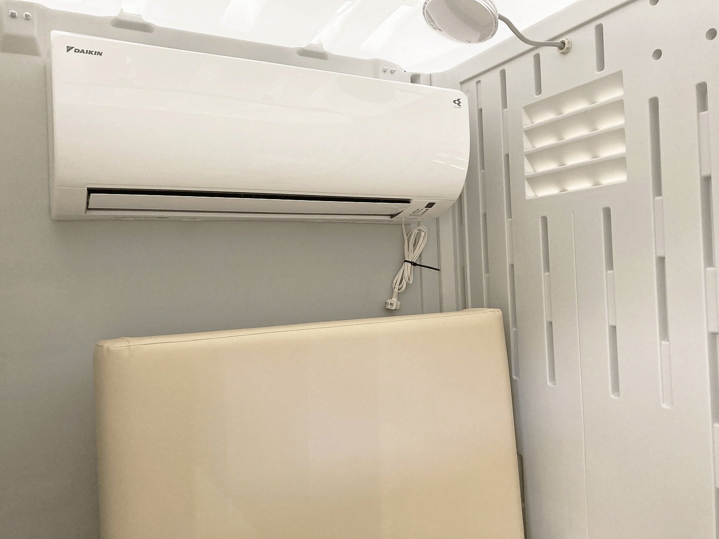 室内にはエアコンが搭載されており、年間通じて安心して利用できます。さらにベビーカーを室内に入れることができるスペースも確保しました。下部にはキャスターが備え付けてあり、施設内の移動も容易に実施できるため施設内のレイアウト変更にも対応可能です。