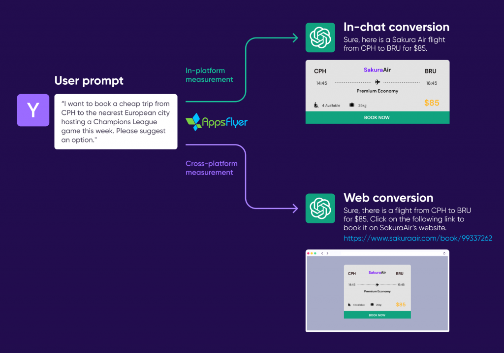 ChatGPTプラグインは、顧客との対話やビジネスチャンスにおいて新たな世界を切り開きました。一方で、クッキーやデバイス識別子がなければ、現在のツールでは分析と計測は不可能です。そこで、AppsFlyerが新たに提供するChatGPTのプラグインは、プライバシー保護に対応した計測と分析サポートによって、ブランド企業や企業のマーケティング担当者の課題解決をサポートします。AppsFlyerのChatGPTプラグインにより、従来のすべてのデジタルプラットフォームやトラフィックソースにおけるマーケティング活動に追加して、ChatGPT上での顧客との対話やプラグインのパフォーマンスに関する分析と実用的なインサイト得ることが可能となります。