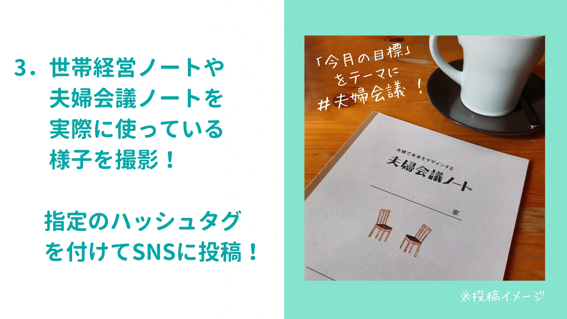 活動で使用するSNS(Twitter/Instagram/Facebook)は、公開アカウントを使用。指定のハッシュタグ付きでSNSに『夫婦会議』の様子を投稿してください。