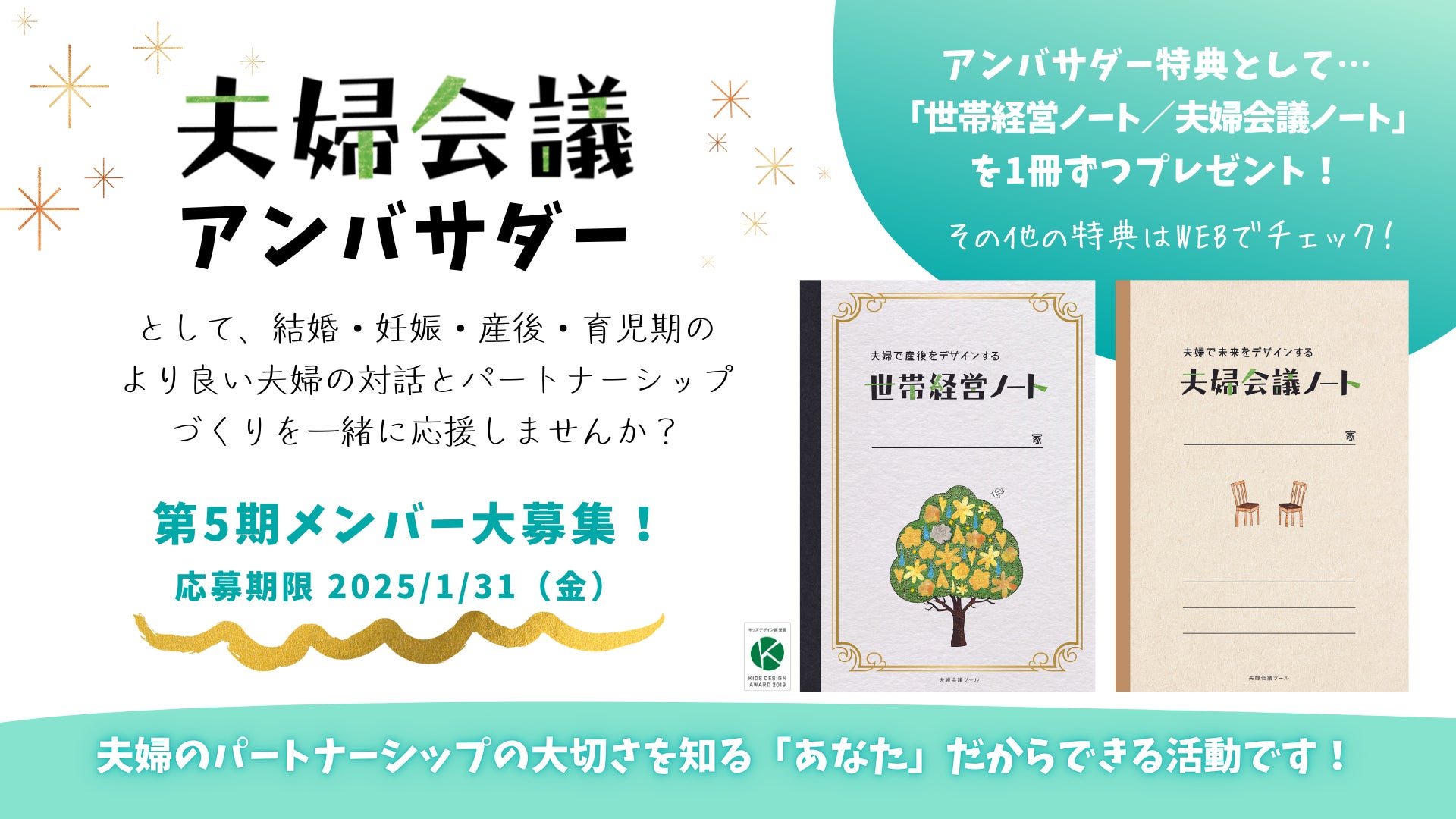 キッズデザイン賞受賞の夫婦会議ツール「世帯経営ノート」のプレゼントなど、特典いっぱいな『夫婦会議アンバサダー®』の活動の詳細と募集内容を以下でご紹介します。