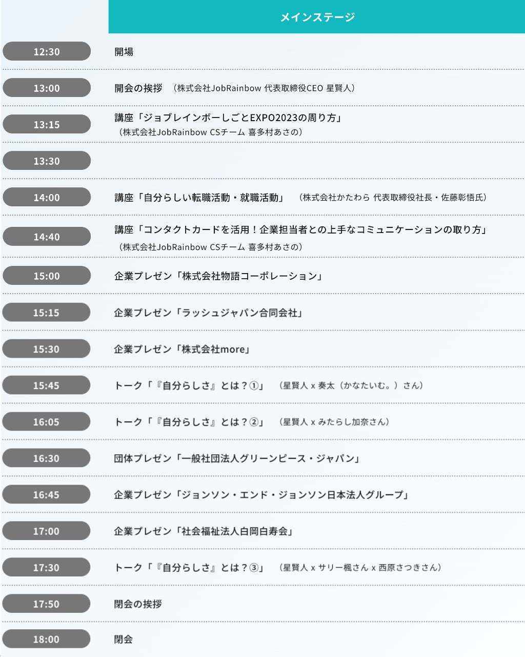 メインステージと企業ブース*は時間ごとにコンテンツをご用意しています。
