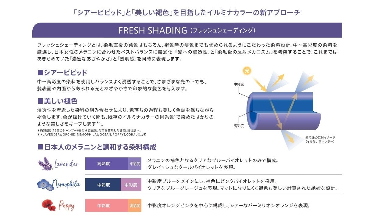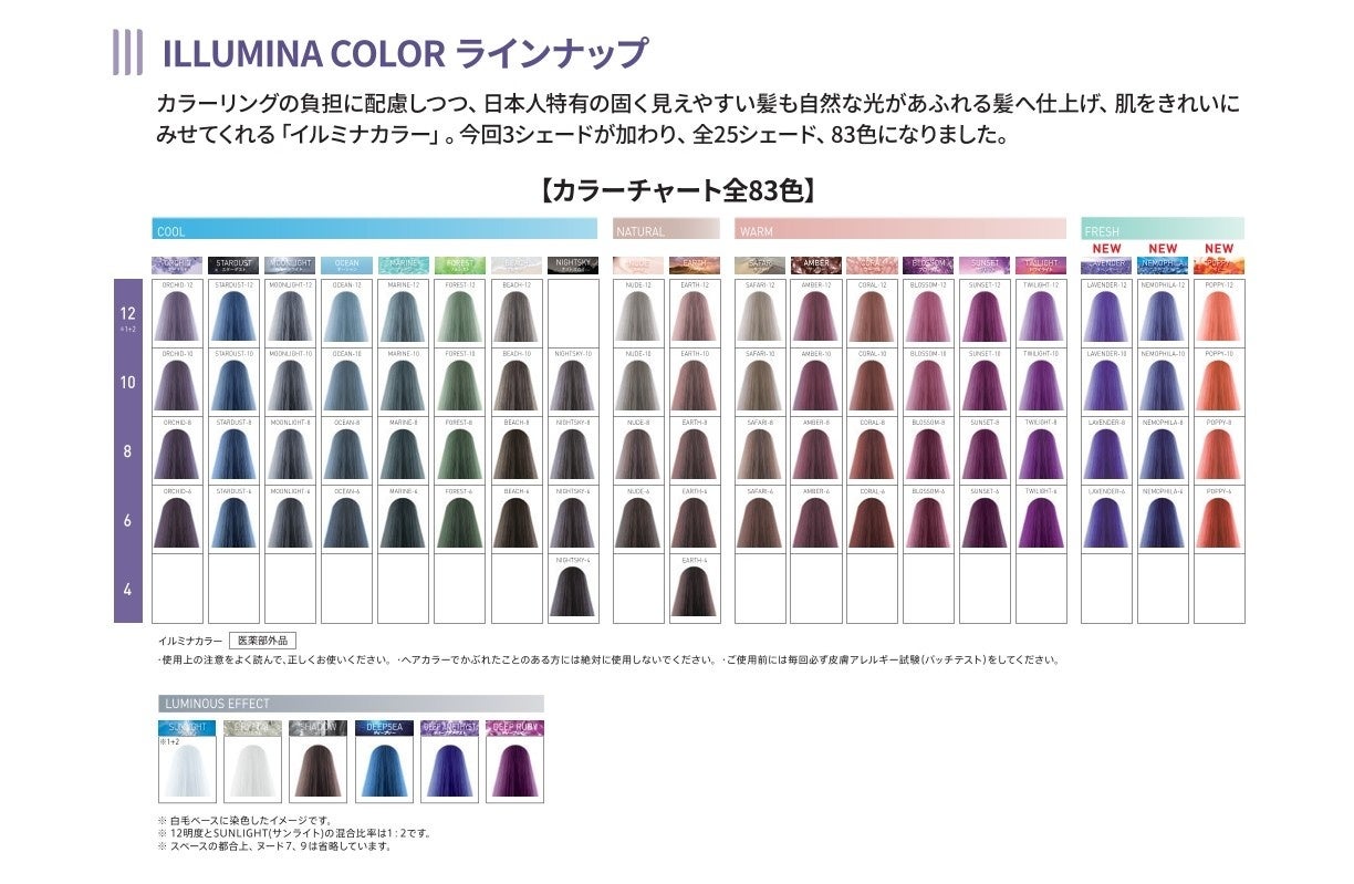 今回、イルミナカラーの既存の「COOL」「NATURAL」「WARM」のラインに加え、新たに「FRESH」ラインが追加。その中から新色シェード「イルミナラベンダー」「イルミナネモフィラ」「イルミナポピー」の3色が「ルミナスフラワーコレクション」として登場いたします。