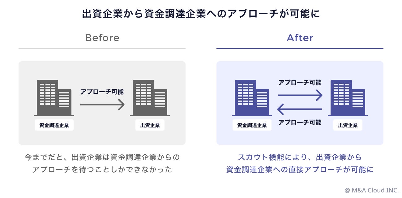 これまで「資金調達クラウド」でのマッチングの方法は、『資金調達を希望する企業』から『出資先を探している企業』への“出資依頼のアプローチ”のみが可能でしたが、「シナジーを見込めるスタートアップを自ら探したい」という出資企業側のニーズに応えるため、この度、新しく「スカウト機能」を開発しました。これにより、双方が求めている企業をより円滑に見つけられるようになるほか、想定していなかった異業種とのマッチングの可能性も創出します。