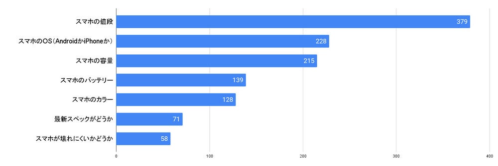 圧倒的に「スマホの値段」を購入の際に検討する方が多いことがわかります。
