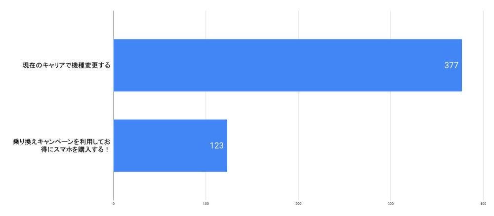 結果は、全体の8割弱の方が「現在のキャリアで機種変更する」と回答しているため、乗り換えキャンペーンを利用するのは少数派ということがわかりました。
