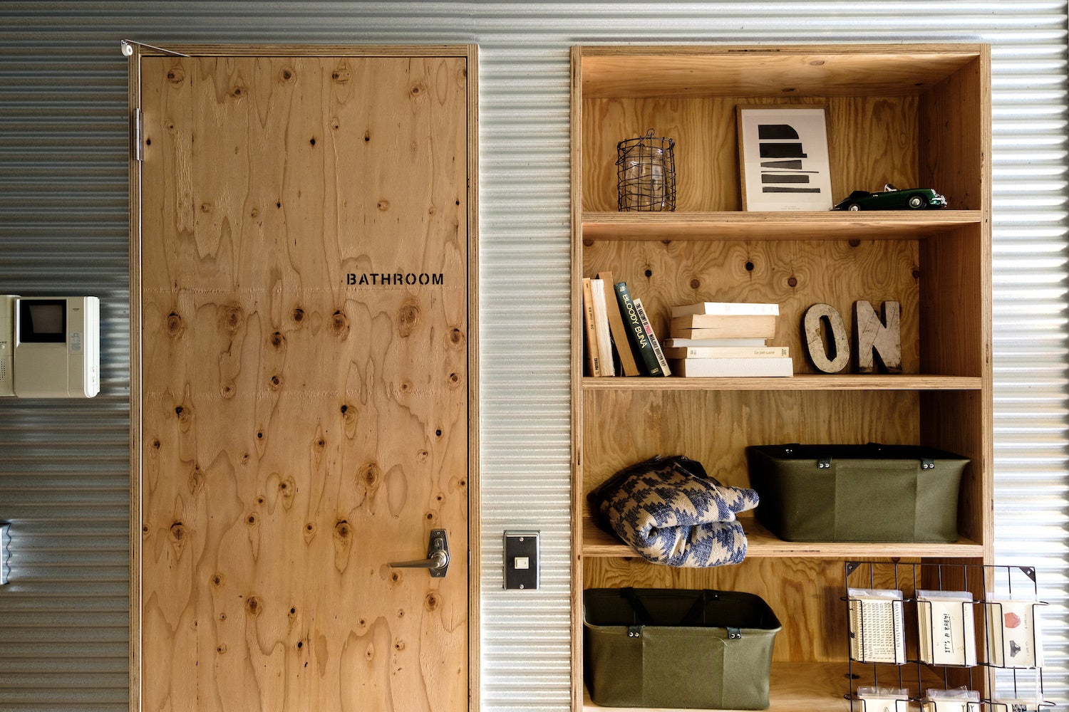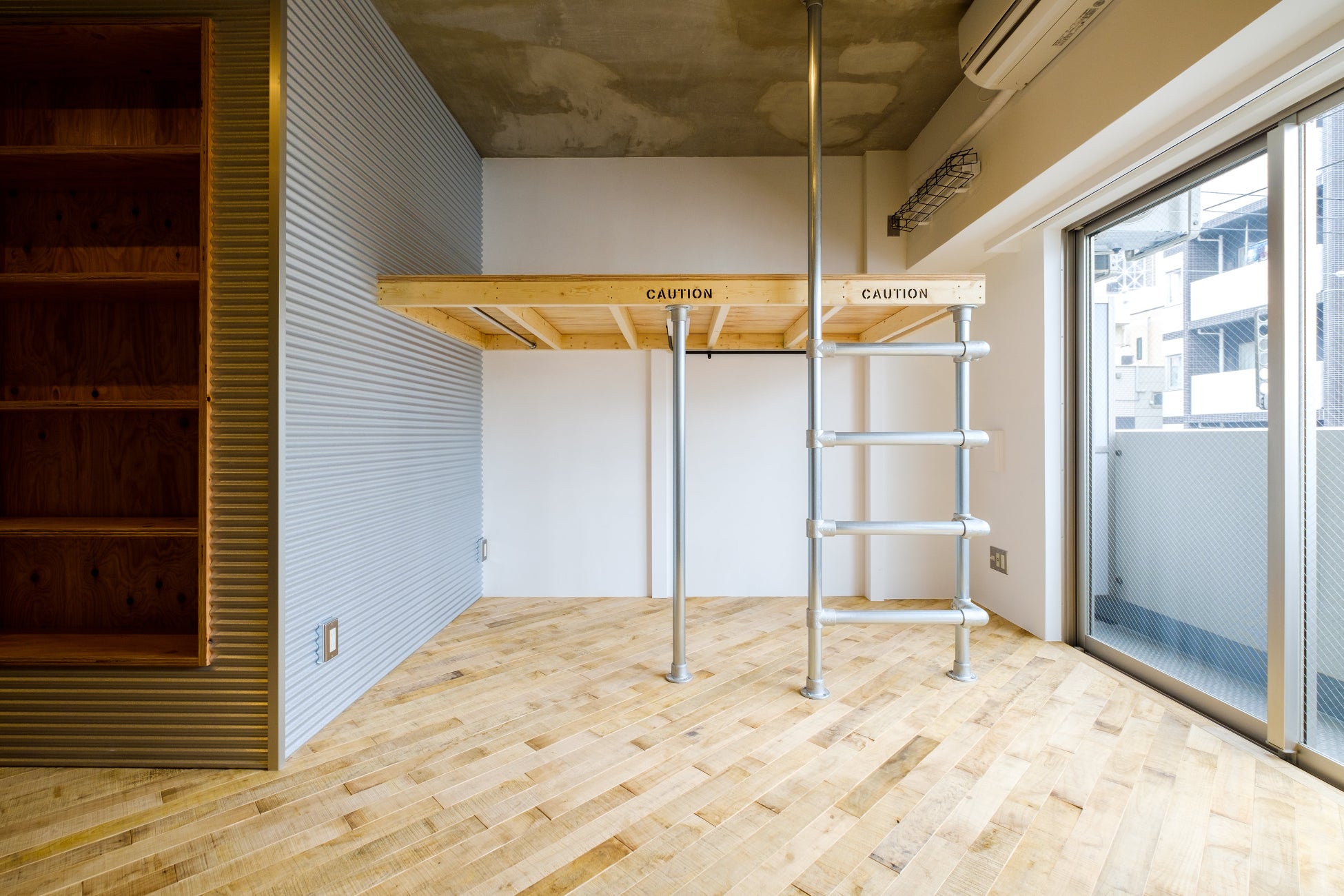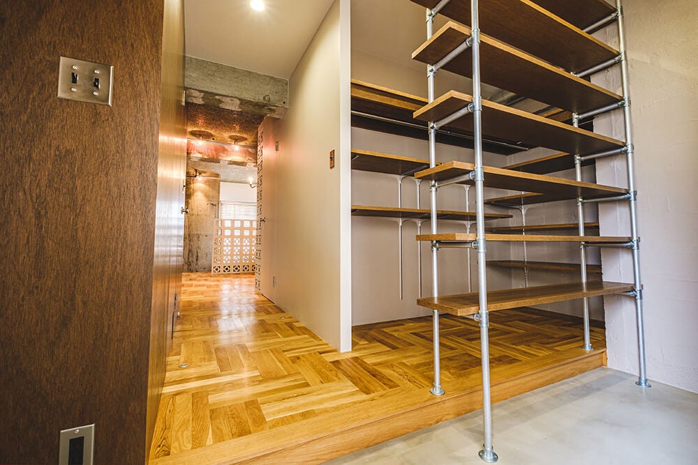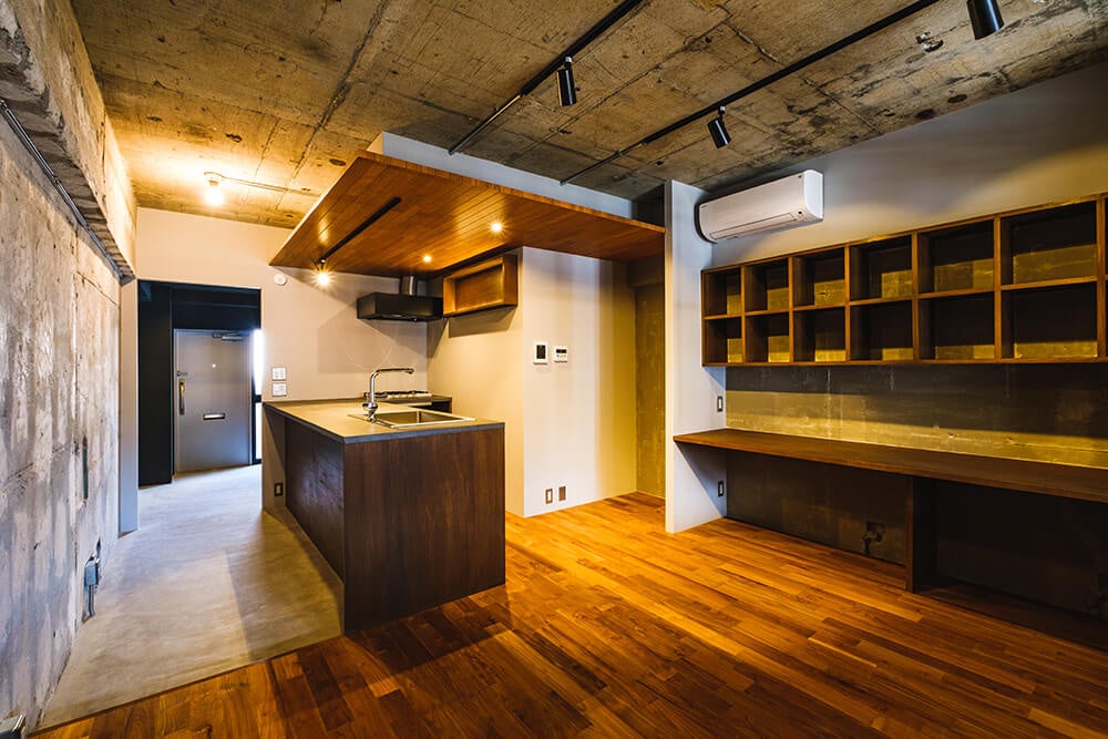 1LDKの空間を贅沢に作り変えました。玄関ではシューズクローゼットとオープンクローゼットが出迎えます。居室のところどころにあしらわれた造作棚が収納の自由さを広げます。居室には、アンティークの小さなシャンデリアが下がり、躯体表し(スケルトン)の無骨な質感と相まってそれぞれの魅力を引き立てます。2面採光の窓からは、自然光がたっぷりと差し込み、花ブロックの繊細な陰影を際立たせます。へリンボーンのパーケットフロアは、高級感を演出。さらに、造作のベッドフレームは空間に調和した一体感を生み出します。