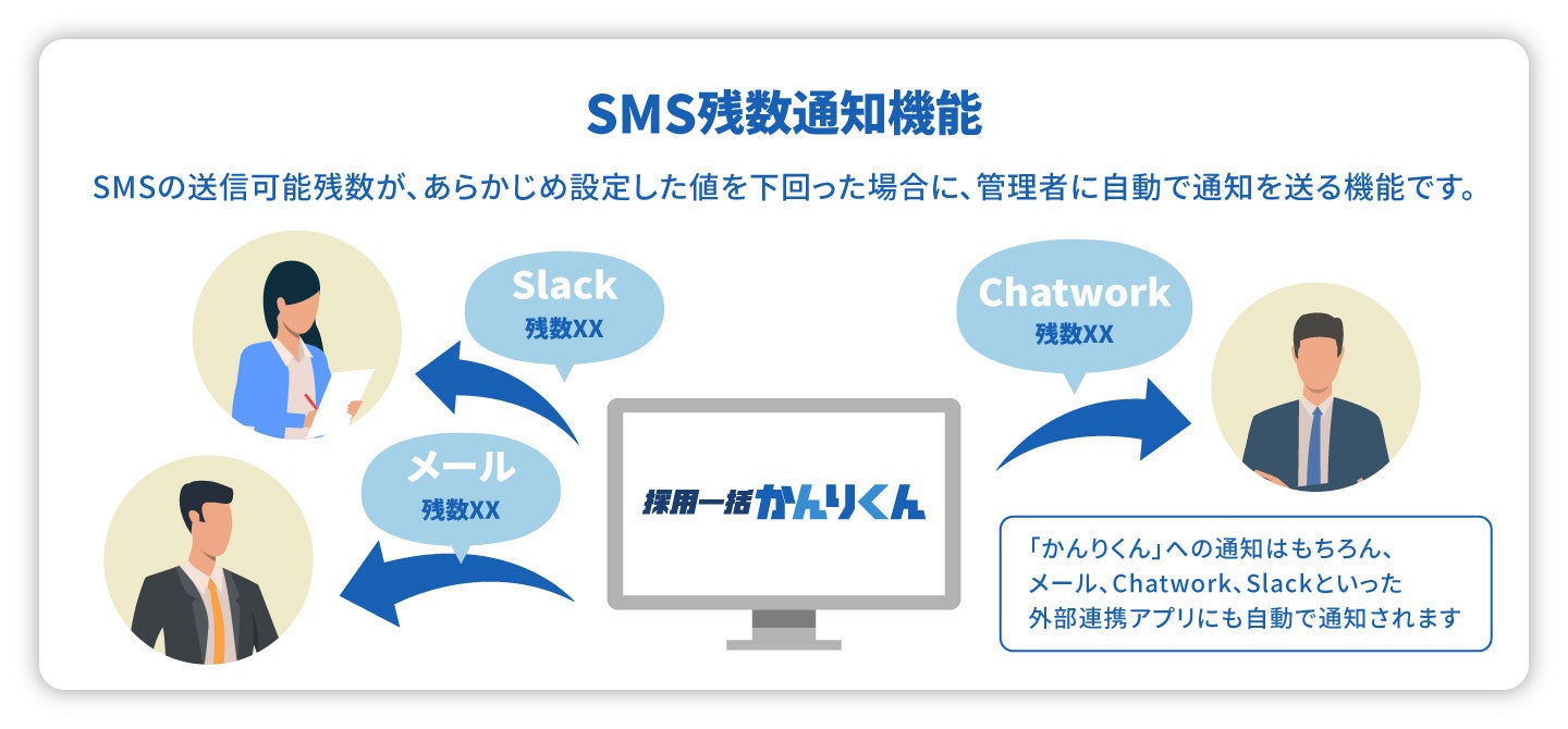 機能内容: SMSの送信可能残数が、あらかじめ設定した値を下回った場合に、管理者に自動で通知を送る機能です。