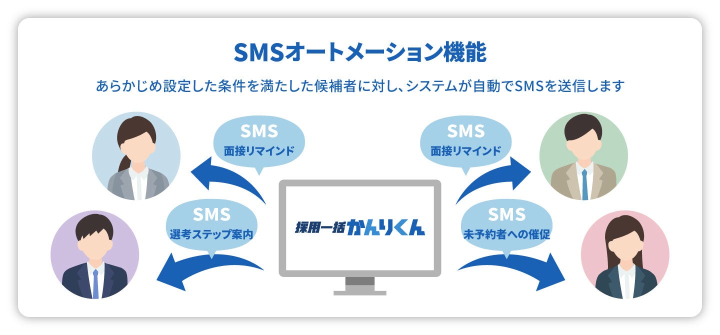 機能内容: 「採用一括かんりくん」のオートメーション機能のアクションとして、SMS送信が設定可能になりました。あらかじめ設定した条件を満たした候補者に対し、システムが自動でSMSを送信します。