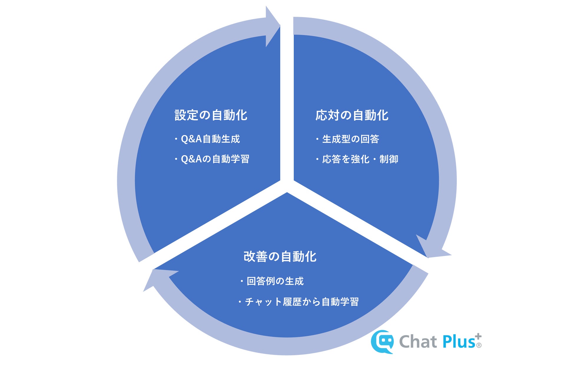 チャットプラスでは、これらの人間が行っていた設定、応対、改善業務を、生成AIで出来るように各機能を開発してきました。このたび、設定、応対、改善に関わるすべての機能実装が完了し、Q&Aの作成から運用、学習まで、今まで人手で行われていた業務のすべてをAIが完全自動化できるようになりました。
