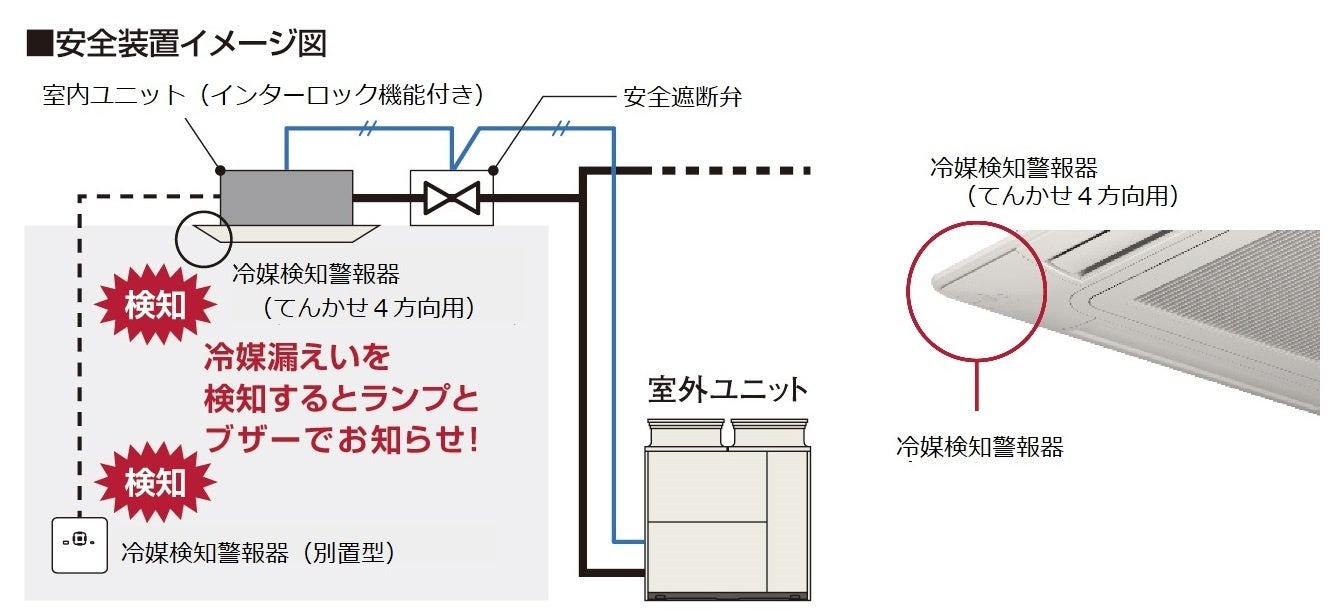 微燃性冷媒R32使用での安全性に配慮し、オプション部品に冷媒検知警報器および安全遮断弁をラインアップしました。冷媒検知警報器は、別置型と、てんかせ4方向用※7の2パターンから選択いただけます。てんかせ4方向用は室内ユニット(てんかせ4方向)に取り付けるため、室内空間を邪魔しません。