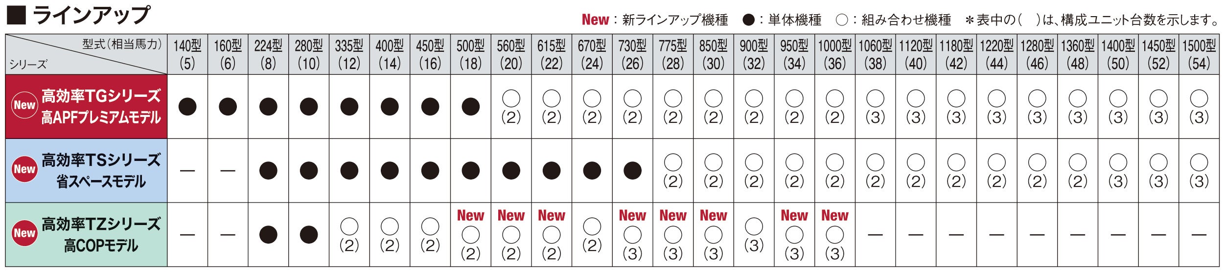 本製品は、当社従来機種と比較してAFP、COPとも向上しました。さらにZEBの需要に向けた高COPモデル(高効率TZシリーズ)を224~1000型までフルラインアップしました。豊富な製品ラインアップでビル空調の省エネ化に貢献します。